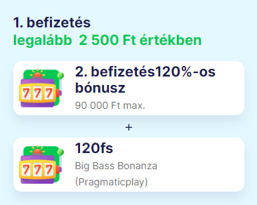 - Pénz bónusz: a befizetésed 120%-ának megfelelő összeg kerül jóváírásra a bónuszegyenlegeden, minimum 3000 Ft befizetés esetén. A maximum bónuszösszeg 90.000 Ft, így az első befizetést maximum 75.000 Ft-ra kell teljesítened ahhoz, hogy érvényesíthesd a bónuszt. További összeg befizetésére is van lehetőség, azonban a bónusz a maximális érték felett már nem aktiválható.